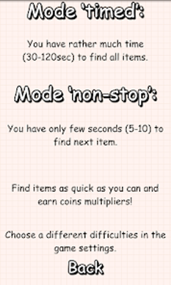 El juego presenta dos modos principales: el 'Modo cronometrado', donde los jugadores tienen entre 30 y 120 segundos para localizar todos los objetos, y el 'Modo sin pausa', que desafía a los usuarios a encontrar el siguiente objeto en pocos segundos. Esta variedad en los modos de juego garantiza que cada sesión sea emocionante y llena de diversión, haciendo de Find The Object una opción ideal para los amantes de los juegos de búsqueda.